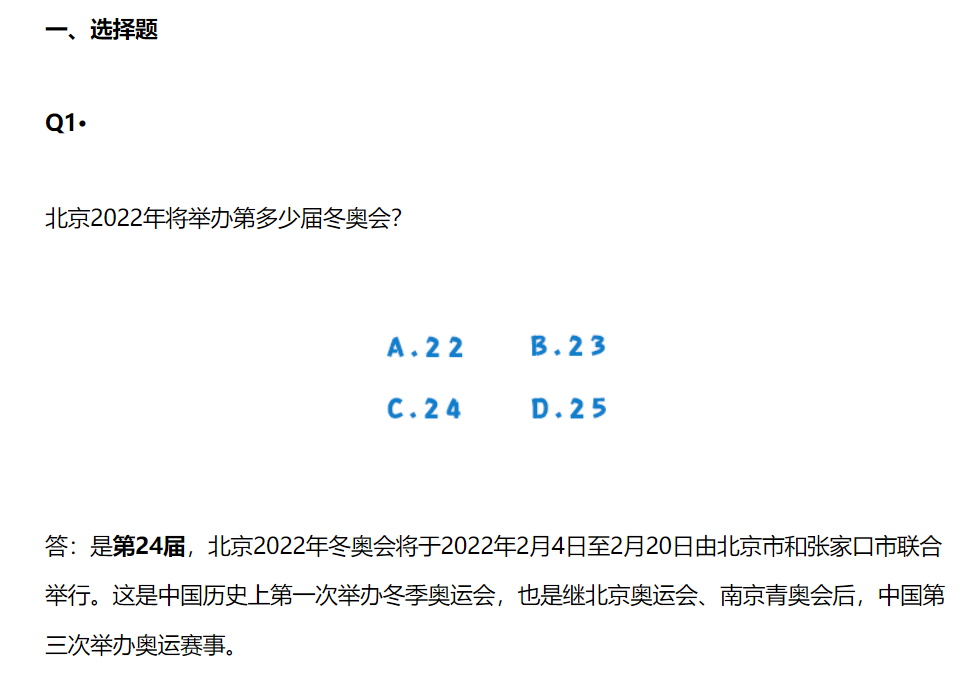 此次比赛中包含:此次冬奥会口号,吉祥物名称,火炬名称,会徽名称,中国队首金获得者等问题,奥运最动人的瞬间不只有夺金,那些拼搏与挑战、突破与超越,都在诠释奥林匹克的意义。无论是初出茅庐的少年,还是身经百战的老将;无论是独自拼搏,还是团队协力,都印刻着中国体育健儿对梦想的不懈追求,他们身上都闪耀着永不放弃、为梦想坚持、为祖国拼搏的豪情与信念。青年学生在不知不觉中提升了精神境界,培养了团结协作的精神。
