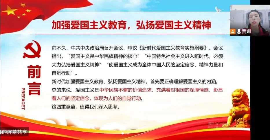 为大力弘扬爱国主义精神,传承中华民族传统美德,确立理想信念,规范文明行为,提高基本素质,在疫情防控期间,深入贯彻落实爱国主义思想教育,太阳集团城娱8722于2022年5月1日利用腾讯会议线上开展“同上一堂爱国主义教育思政课”活动。学生党支部书记贾娜老师主讲,全体大一同学参加。