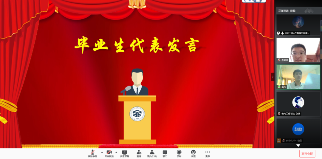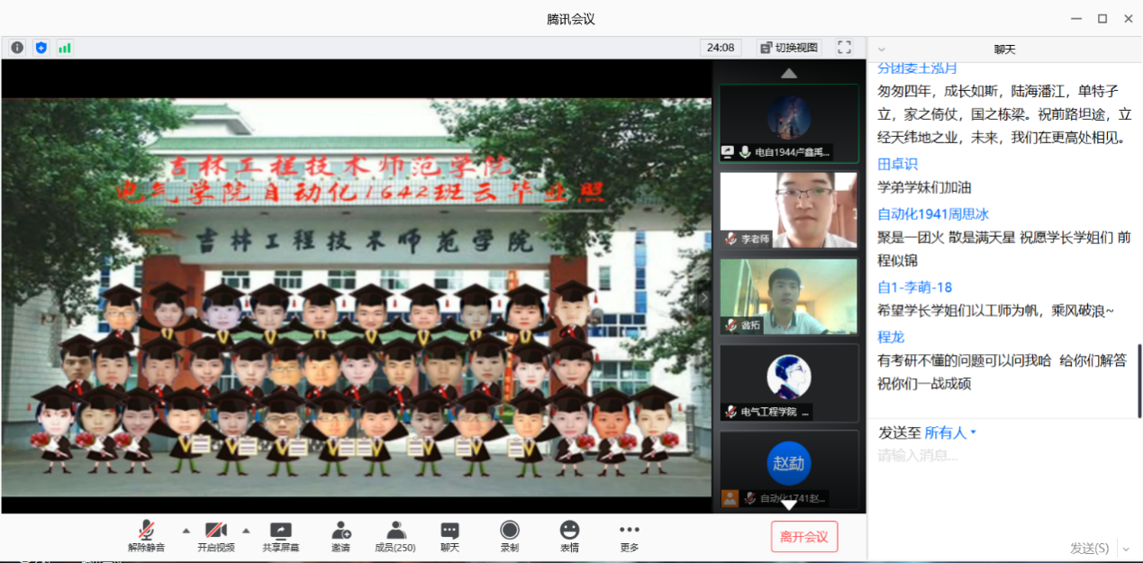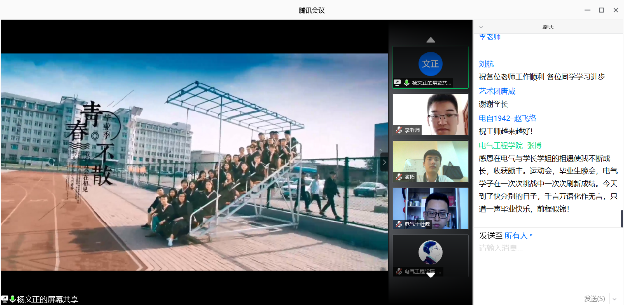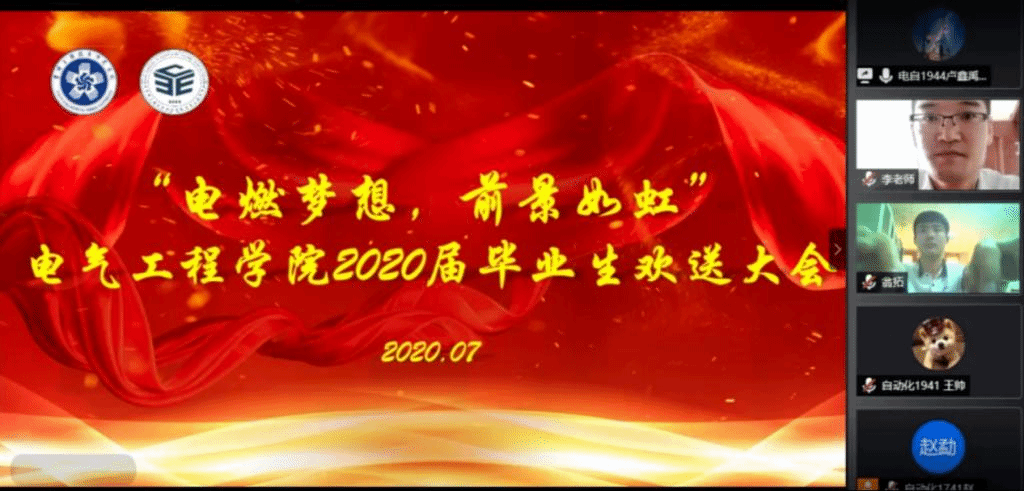 为欢送2020届毕业生,为四年的大学生活画上一个完美的句号,电气工程学院特借助网络平台,于2020年7月12日上午9:30举办“电燃梦想,前景如虹”2020届毕业生欢送大会。电气工程学院全体教师,20届毕业生及部分在校学生参加了本次活动。
