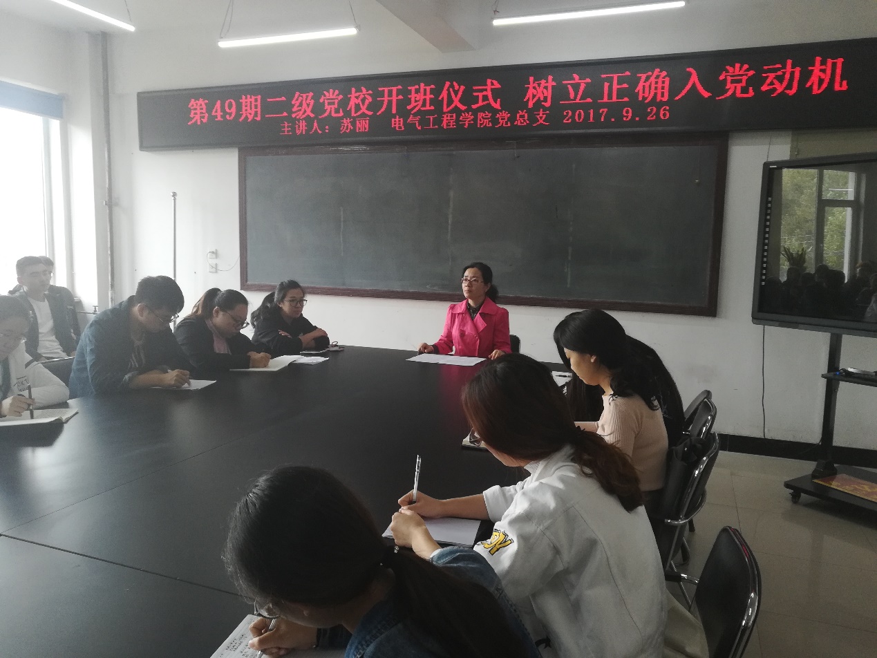 电气工程学院第49期二级党校开班仪式于2017年9月26日,在新实验楼313正式举行。电气工程学院党总支副书记苏丽老师、电气工程学院辅导员郑岩老师参加了本次仪式。